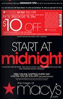 Macy’s is opening their retail stores at midnight on Black Friday. There is a coupon that will be in the newspaper ad circular for $10 off your purchase of $25 or more. The coupon is valid on Friday, November 23, 2012 or Saturday, November 24, 2012 until 1 p.m. on each day. The coupon states that it is for $10 Off All Sale & Clearance Apparel and Select Home Items; it does not include Specials and Super Buys. There is a limit of one coupon per customer. If you do not have the newspaper ad insert, you can print the coupon by visiting Macys.com. Black Friday doorbuster deals at Macy’s is between midnight and 1 p.m. on Friday, and again on Saturday between 7 a.m. and 1 p.m. The store hours may vary depending on the state.